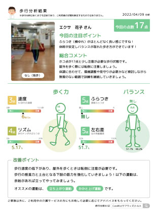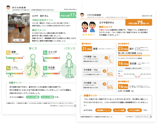 分析結果に基づいたおすすめの運動を出したり、継時比較など介護サービス内で使いやすい機能が備わっています。