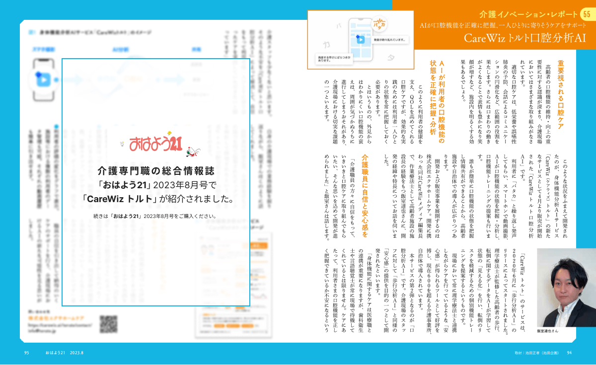- AIが口腔機能を正確に把握、一人ひとりに寄りそうケアをサポート2023.07.14雑誌おはよう21