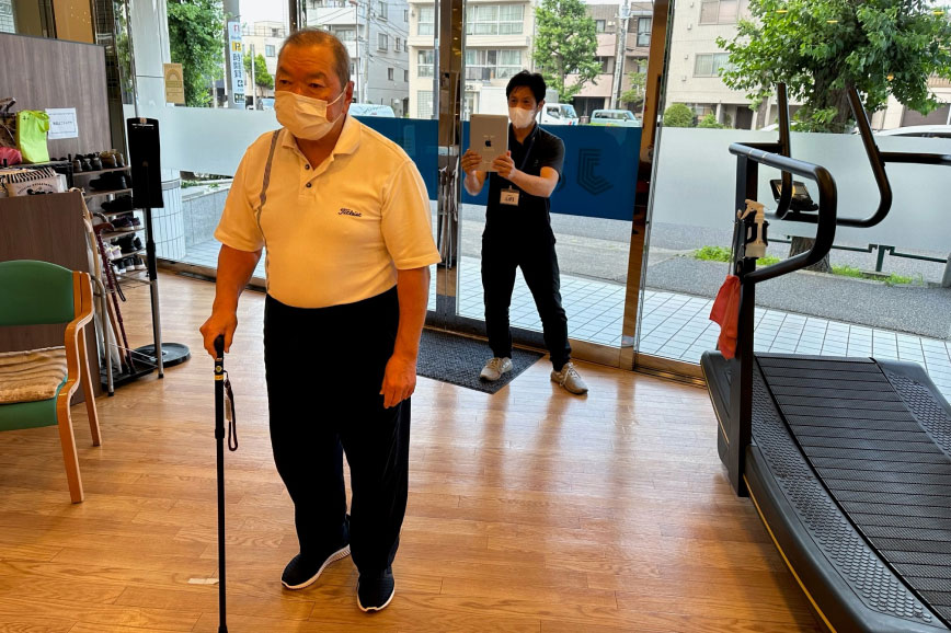 もともと問題なく生活されていた75歳の男性が、コロナ感染による入退院後に下肢筋力が低下し、退院時は車いすを使用するほどでした。それからは自宅で過ごせるようにと、なんとか伝い歩きで歩けるようになった状態をCareWiz トルトで分析しましたが、点数がかなり低かったです。普段なかなか自身の歩行の様子を見ることはないですから、ご利用者さん自身もご自分の歩く姿を見て、意識が変化しました。それからはトレーニング中も「どれくらいの距離で」「どれくらいの速度で」また「どのような運動をすれば改善していくのか」をご本人がかなり意識するようになりました。1年半後にはご自宅のある大田区から江の島まで電車を使って観光するなどおよそ2万歩歩けるまでに回復し、日々の行動範囲も広がり、歩行がかなり改善されたことをご利用者さん自身も実感しています。