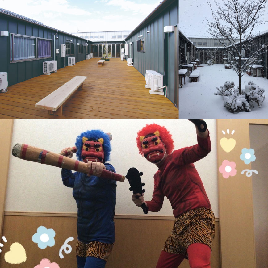 - 【ハード面】 四季を感じられる中庭を囲うように施設を一周できる設計になっており、歩行訓練などの意欲が高まる工夫をしています。