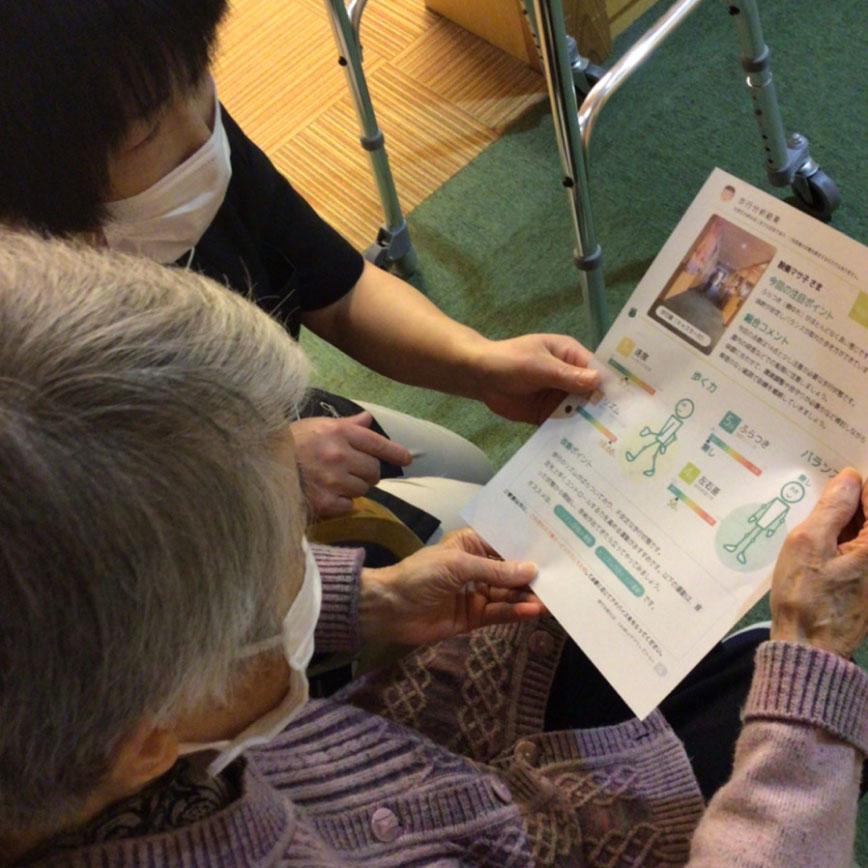 新規のご利用者様がご入居されたら、ケアプラン作成と並行しケアマネジャーと機能訓練指導員がiPadでご利用者、ご家族の同意のもと、動画撮影しCareWiz トルトで歩行分析させていただいています。分析結果をもとに転倒などのリスクをご利用者、家族、職員で共有しています。また、個別機能訓練計画作成時と3か月毎にCareWiz トルトを使用し歩行分析を行い、計画の立案、変更、評価に役立てています。注意点としては撮影するから歩いてと伝えてしまうと利用者様が意識、緊張してしまい普段と違う歩行状態になってしまうのでできるだけさりげなく撮影する事です。